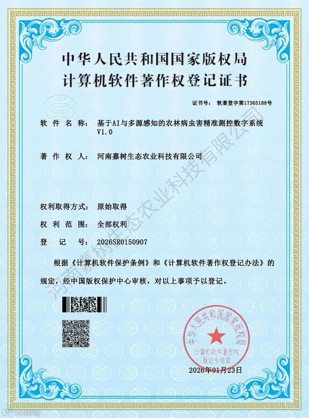 河南嘉樹生態(tài)農(nóng)業(yè)科技有限公司2026年1月23日,河南嘉樹生態(tài)農(nóng)業(yè)科技有限公司再次獲得一項(xiàng)國家計(jì)算機(jī)軟件著作權(quán)登記證書,本次“基于AI與多源感知的農(nóng)林病蟲害精準(zhǔn)測控?cái)?shù)字系統(tǒng)”的獲證,是對公司自主創(chuàng)新能力的再次認(rèn)可和鼓勵(lì),公司將持續(xù)深耕AI領(lǐng)域,為客戶提供更智能、更高效的服務(wù)!
