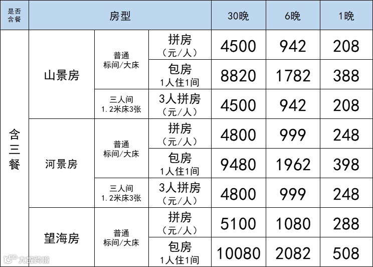 4.春節(jié)加價(jià):2026年2月16日-2月23日(除夕至初七),共8晚,加200元/間/晚;三人間按1.5倍計(jì)算。其他節(jié)假日加價(jià)待定