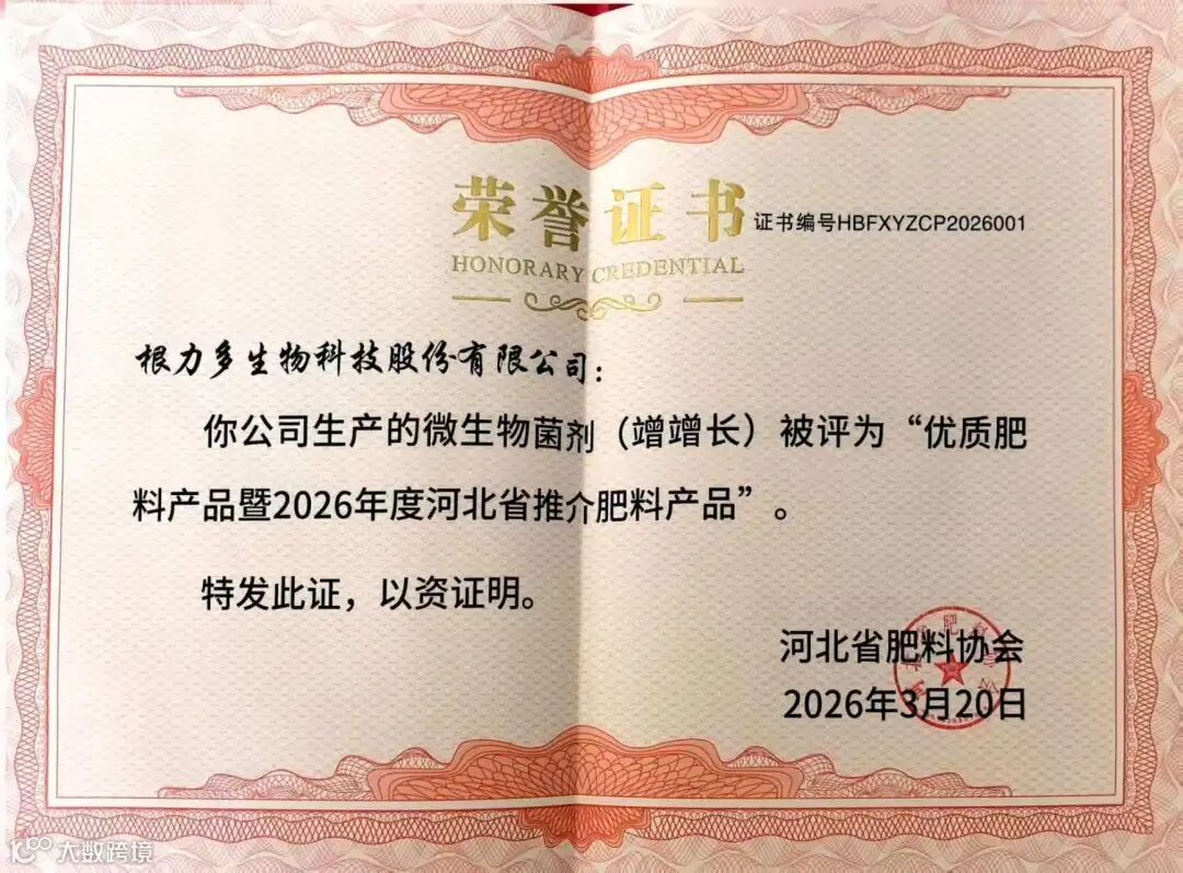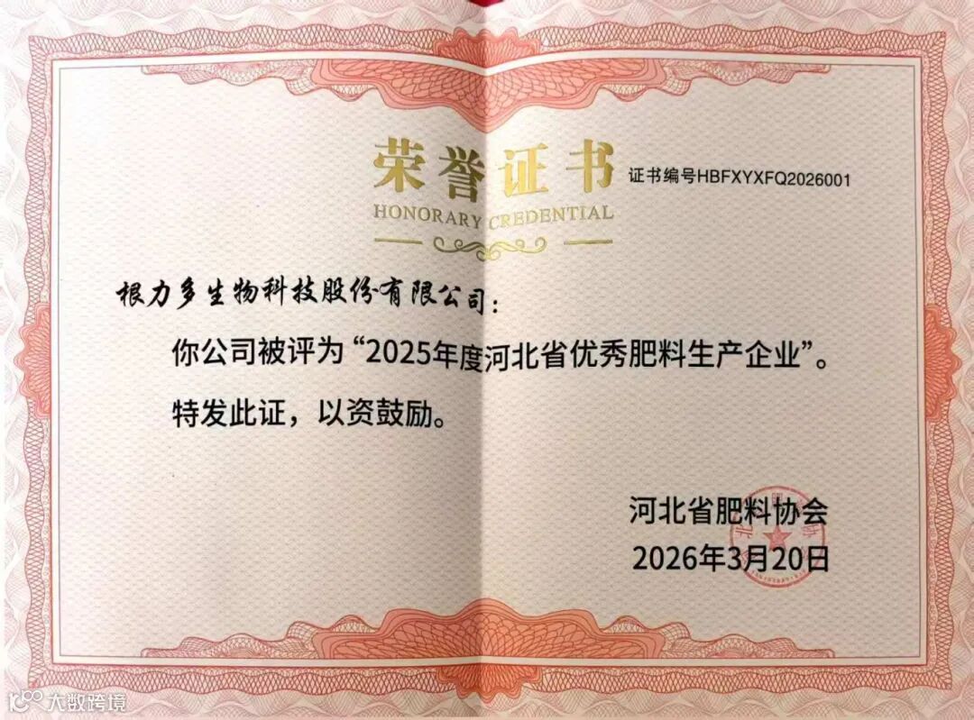 近日,河北省肥料協(xié)會(huì)發(fā)布2025—2026年度行業(yè)評(píng)選結(jié)果,根力多生物科技股份有限公司憑借卓越的綜合實(shí)力與突出的產(chǎn)品表現(xiàn),榮獲“2025年度河北省優(yōu)秀肥料生產(chǎn)企業(yè)”稱(chēng)號(hào),同時(shí),其核心產(chǎn)品——“竲竲長(zhǎng)”被評(píng)為“優(yōu)質(zhì)肥料產(chǎn)品暨2026年度河北省推介肥料產(chǎn)品”。雙項(xiàng)榮譽(yù)的授予,不僅是對(duì)根力多二十余年深耕生物肥料領(lǐng)域的高度認(rèn)可,更是對(duì)其科技創(chuàng)新與綠色發(fā)展理念的權(quán)威肯定。