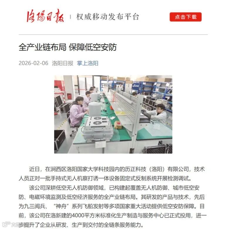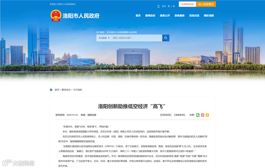 1月23日,《洛陽日報》專題報道公司技術(shù)底蘊與行業(yè)貢獻;洛陽市政府官網(wǎng)同步肯定其在低空安防領(lǐng)域的引領(lǐng)作用。