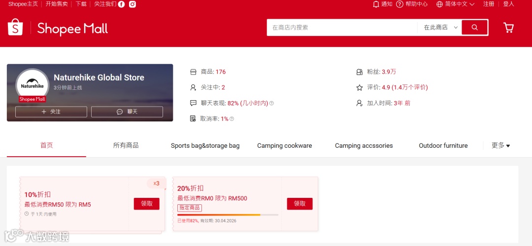 電商渠道是品牌觸達(dá)用戶的核心陣地。Shopee 平臺,Naturehike 針對性推出了輕量化帳篷、睡袋、戶外桌椅等適配產(chǎn)品,兼顧高性價(jià)比與實(shí)用功能性。