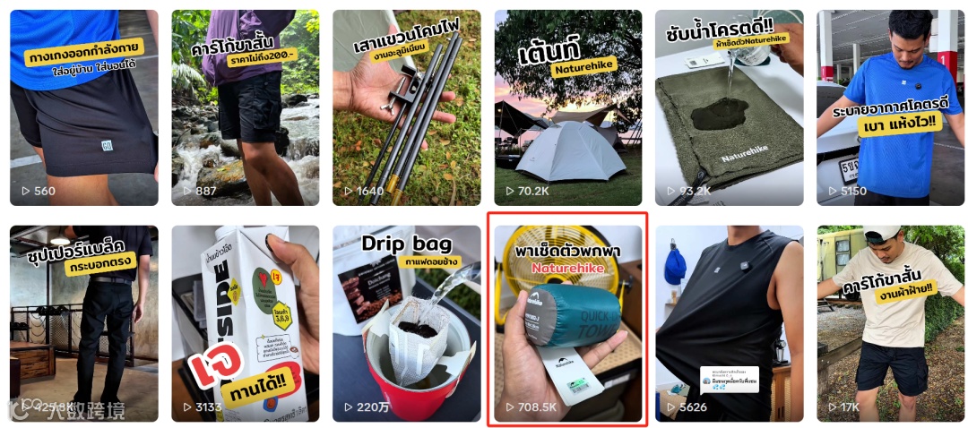其中與泰國露營達(dá)人 @sasichoat 合作的速干毛巾產(chǎn)品展示視頻,就斬獲了 70.85 萬播放量,直觀的產(chǎn)品測評幫助新手用戶快速認(rèn)知產(chǎn)品優(yōu)勢,直接帶動(dòng)了銷量的爆發(fā)。