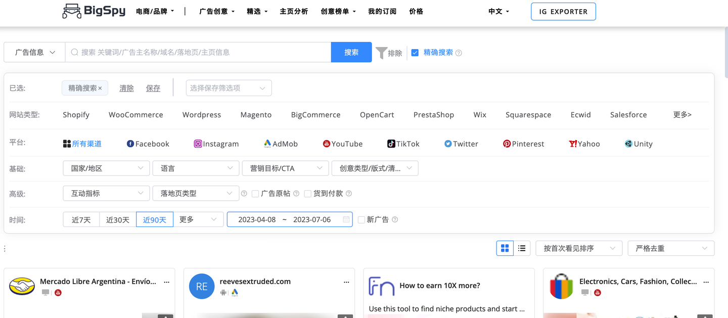 Facebook Ad Library官方就能搜,但界面太樸素,篩起來像考古。想要更順滑的體驗,可以偷偷用BigSpy這類第三方工具:輸入關(guān)鍵詞,設(shè)定點贊、評論、投放天數(shù),幾秒鐘就能把最近90天的爆款素材扒個底朝天。我最愛它的“按著陸頁流量排序”功能,誰真出單、誰在燒錢,一眼看穿。友情提醒:別上來就盯著頭部大賣,腰部賣家的素材往往更新鮮,跟進(jìn)去容易超車。