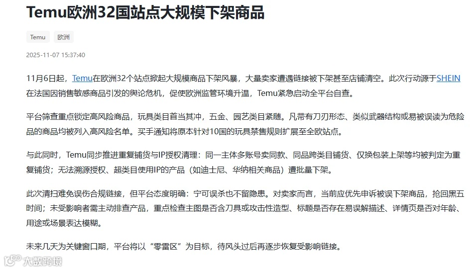 也不知道是不是因為Temu和Shein在國外買家眼里總被“綁定”在一起,這下好了,Temu也跟著躺槍……聽說有些站點和產(chǎn)品被下架,新品的上架也暫停了。