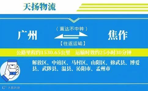 13826279566點擊撥打電話 天揚物流廣州至焦作專線1530.65公里25小時30分鐘極速直達,全程高速覆蓋焦作全域及解放區(qū)、中站區(qū)、馬村區(qū)、山陽區(qū)、修武縣、博愛縣、武陟縣、溫縣、沁陽市、孟州市,主城區(qū)免費上門提貨。提供整車/零擔/冷鏈/大件運輸,配備AI監(jiān)控+三維固定+溫控技術(shù),支持運輸險及智能動態(tài)計費,企業(yè)可定制月結(jié)方案。