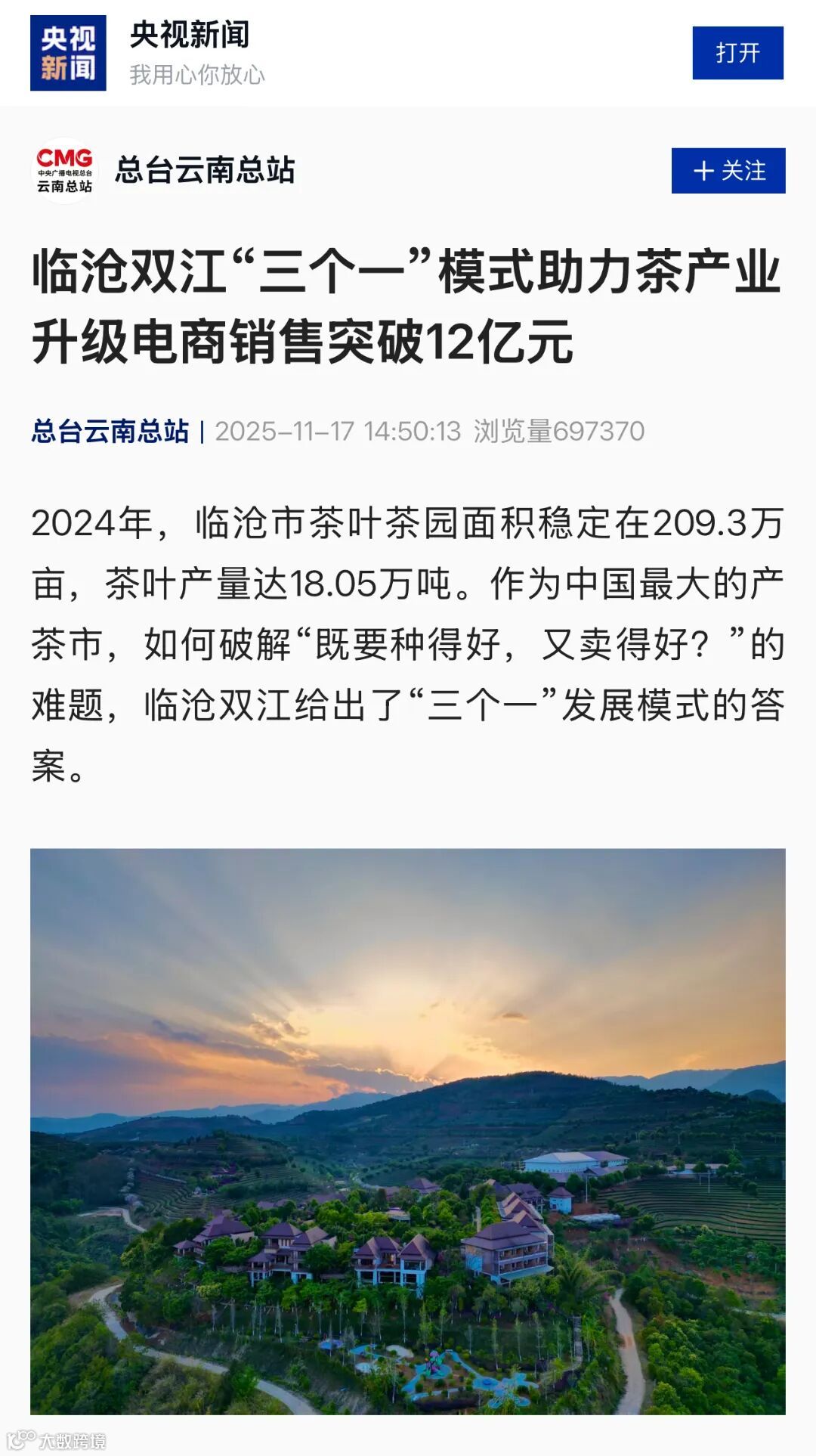 2024年,臨滄市茶葉茶園面積穩(wěn)定在209.3萬畝,茶葉產(chǎn)量達18.05萬噸。作為中國最大的產(chǎn)茶市,如何破解“既要種得好,又賣得好?”的難題,臨滄雙江給出了“三個一”發(fā)展模式的答案。
