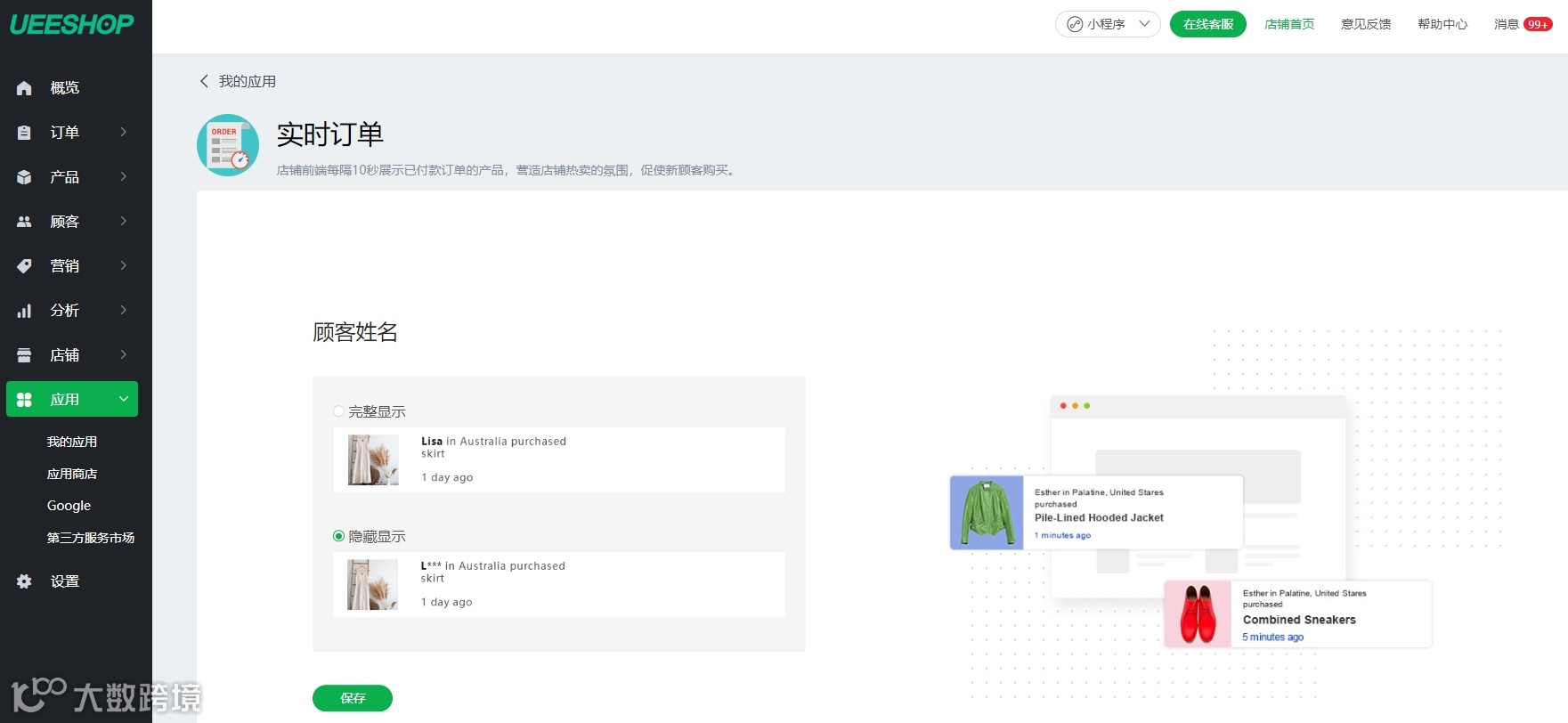 值得注意的是,由于海外消費(fèi)者是比較注重隱私的,因此賣家在開啟實(shí)時(shí)訂單展示時(shí),最好選擇隱藏部分姓名。