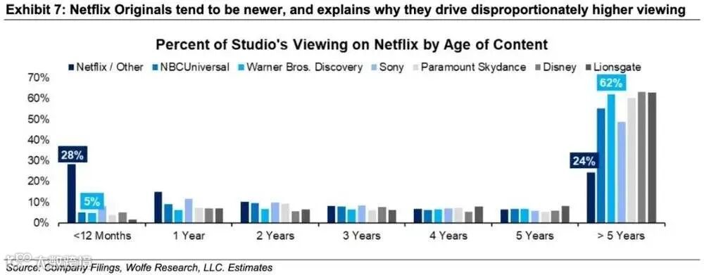 這無疑會對內(nèi)容制作端的推陳出新,給到更多的壓力。但通過采購?fù)獠?IP 授權(quán),并不能解決核心問題。從 Netflix 目前的內(nèi)容分布來看,外部 IP 授權(quán)的內(nèi)容多為 5 年以上發(fā)布年限的老內(nèi)容,各家自制的新鮮內(nèi)容不會輕易拿出來對外授權(quán)。