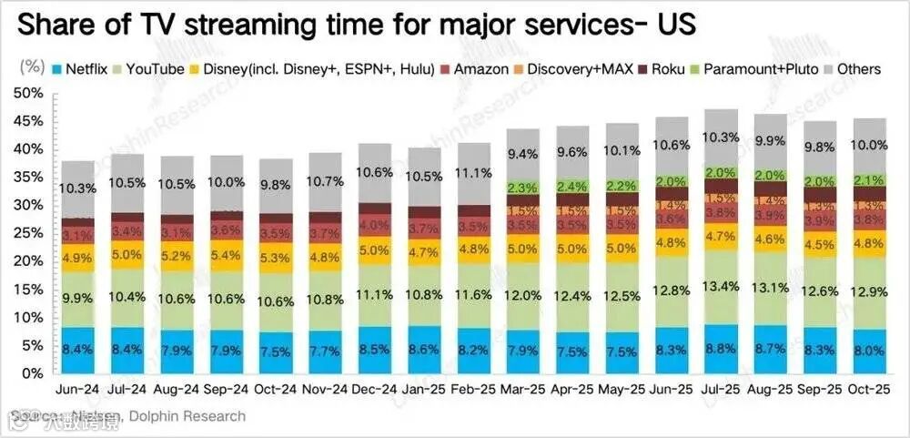 在流媒體領(lǐng)域,Netflix 用戶 3.2 億,WBO 旗下的 HBO MAX 用戶 1.2 億,其中美國地區(qū)分別為 0.9 億和 0.24 億,合計占到了美國總用戶規(guī)模的 34%(根據(jù) MNTN 研究,2025 年 Q2 美國流媒體訂閱用戶數(shù)達到 3.4 億)。