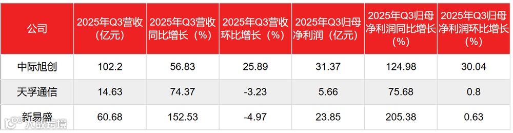 從三季度的表現(xiàn)來(lái)看,僅中際旭創(chuàng)Q3營(yíng)收、歸母凈利潤(rùn)同比、環(huán)比均有所增長(zhǎng)。而天孚通信、新易盛業(yè)績(jī)低于預(yù)期,營(yíng)收環(huán)比均有所下滑。盡管新易盛表示,2025年Q3因受到部分產(chǎn)品出貨階段性節(jié)奏變化的影響所致,但資本市場(chǎng)未必買(mǎi)賬。