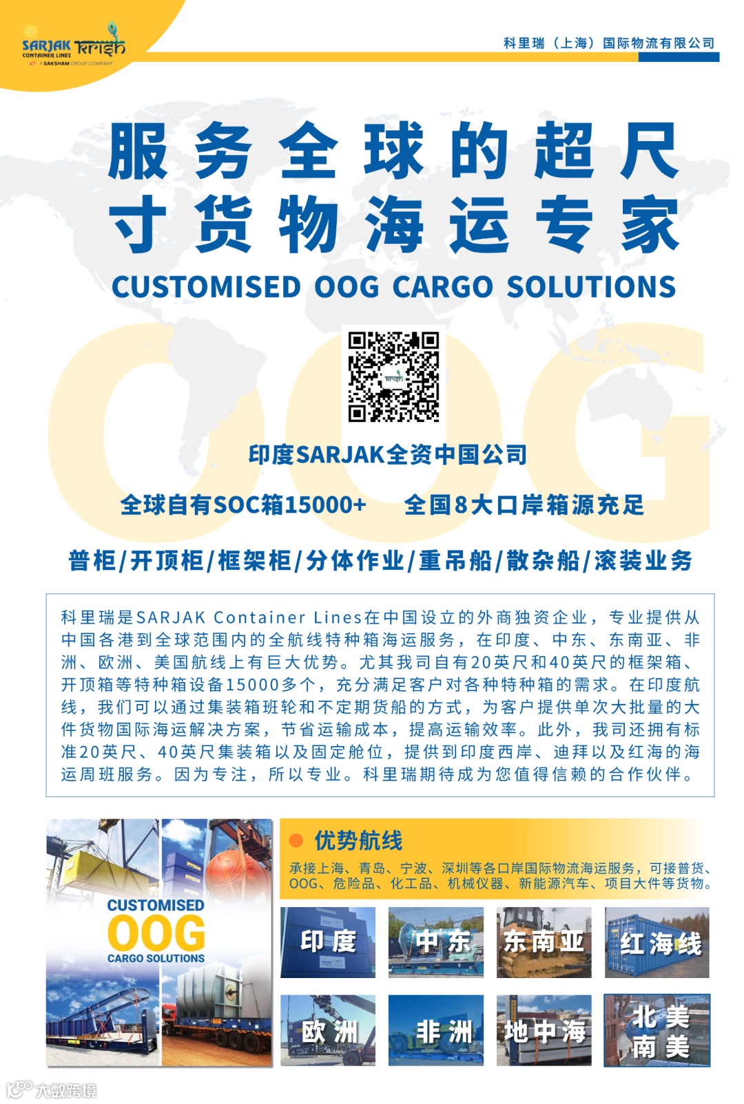 科里瑞 科里瑞(上海)國際物流有限公司為SARJAK在中國的全資子公司。Sarjak擁有超過15000多個的各種型號特種箱,可以為客戶提供全球范圍內(nèi)的貨物運(yùn)輸和重大件設(shè)備全球運(yùn)輸服務(wù)。我們在中國主要港口可以提供適合各種超尺寸設(shè)備運(yùn)輸?shù)淖詡涮胤N箱。