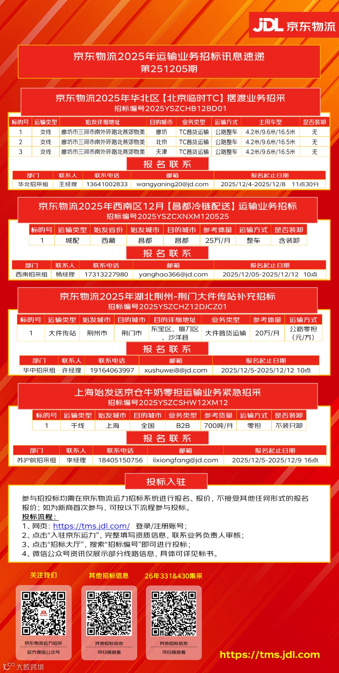 【招標(biāo)公告】廊坊始發(fā)支線、昌都城配、荊州大件傳站、上海始發(fā)干線 京東物流運(yùn)力招采