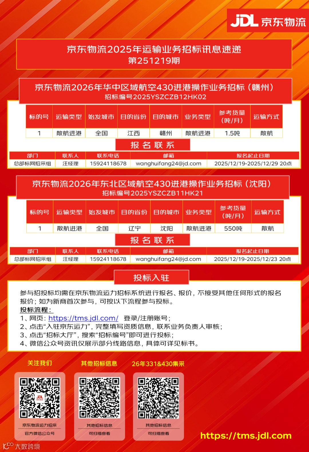 【招標(biāo)公告】華中-贛州航空430進(jìn)港操作業(yè)務(wù)招標(biāo)、東北-沈陽航空430進(jìn)港操作業(yè)務(wù)招標(biāo) 京東物流運(yùn)力招采