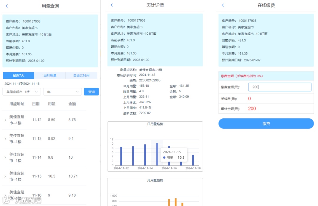 用戶可以在手機(jī)端查詢每天、每月的用電情況,可以通過手機(jī)隨時繳納電費(fèi),讓用戶用電清晰明了,降低管理人員的工作量,提高用戶體驗感。