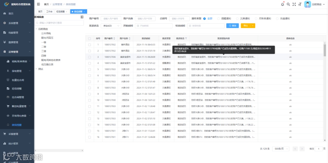 (4) 通知的訂閱功能,系統(tǒng)能對用戶自動進(jìn)行短信和微信通知推送,內(nèi)容包括余額不足告警通知、欠費(fèi)停電告警通知、月能耗和費(fèi)用賬單通知等。
