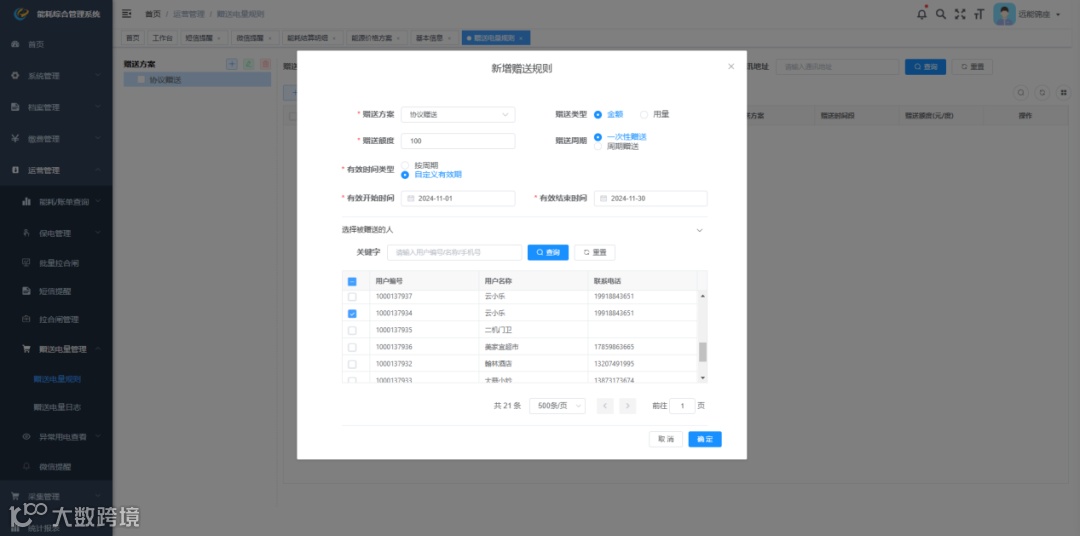 可對特定用戶進(jìn)行定期或一次性的電量/電費(fèi)贈送,系統(tǒng)結(jié)算時會先扣除贈送部分,再結(jié)算用戶繳納部分。