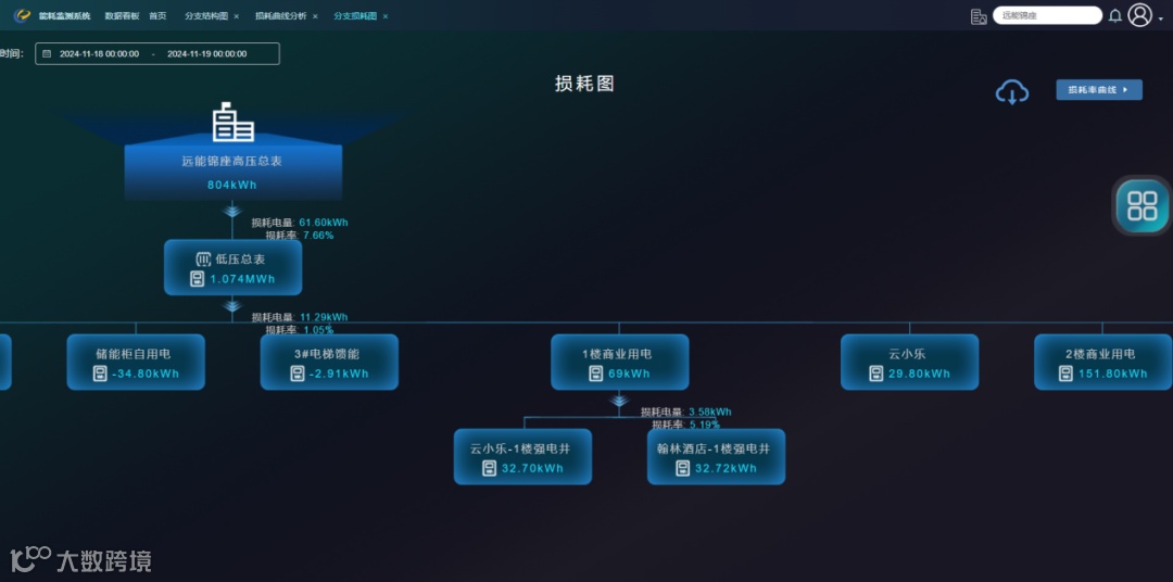 實現(xiàn)四級計量的能耗、損耗、供電質(zhì)量等能耗相關(guān)數(shù)據(jù)的監(jiān)測與分析,系統(tǒng)每日自動計算統(tǒng)計變損及線損,做到損耗的精確分析。