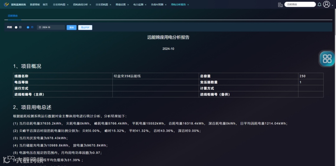 7)以變壓器為單位,按日,按月自動生成用能分析報告,包括供電量、售電量、變壓器運(yùn)行工況及整改建議。