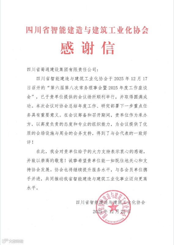 12月22日,公司收到四川省智能建造與建筑工業(yè)化協(xié)會發(fā)來的感謝信,信中對公司承辦“第六屆第八次常務(wù)理事會暨2025年度工作座談會”所展現(xiàn)的專業(yè)組織能力與高效會務(wù)支持予以充分肯定,并表達衷心感謝。