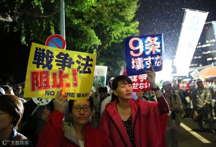 2015年9月16日,在日本東京國會大樓前,人們手持標(biāo)語參加集會,反對日本政府強行推動國會通過新安保法案。新華社記者 劉天 攝