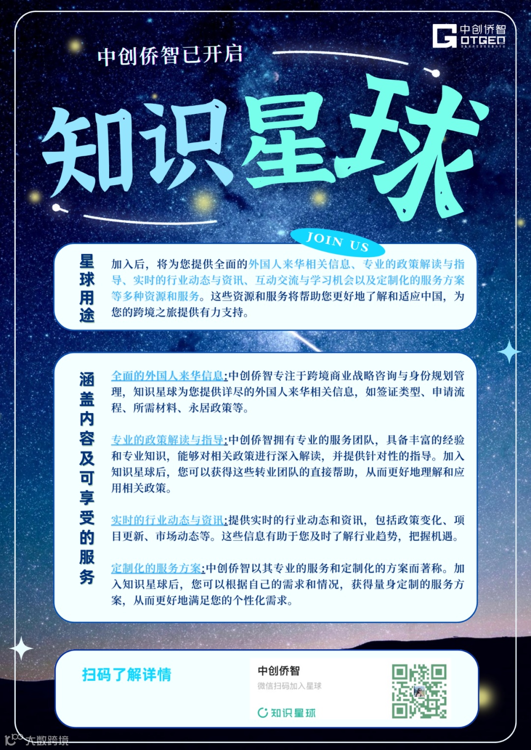 更多信息獲取可加入中創(chuàng)僑智知識星球,將為您提供全面的外國人來華相關信息、專業(yè)的政策解讀與指導、實時的行業(yè)動態(tài)與資訊、互動交流與學習機會以及定制化的服務方案等多種資源和服務。這些資源和服務將幫助您更好地了解和適應中國,為您的跨境之旅提供有力支持。掃描下方二維碼可付費加入。