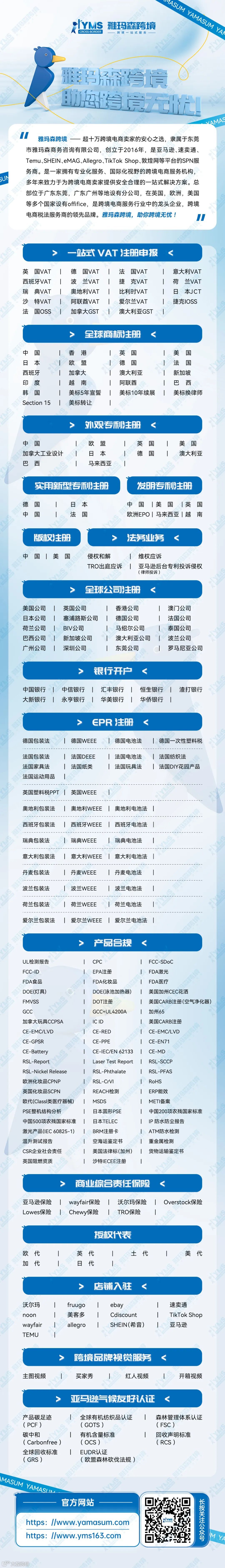 雅瑪森跨境一站式服務(wù)咨詢有限公司是一所具有戰(zhàn)略格局的跨境電商服務(wù)商。是亞馬遜、速賣通、Temu、SHEIN、eMAG、Allegro、TikTok Shop、敦煌網(wǎng)等平臺的SPN服務(wù)商。公司在大陸、香港以及歐美均有分支機構(gòu),公司由眾多具有豐富經(jīng)驗及專業(yè)資格的香港會計師、英國會計師、律師、電商大賣和企業(yè)管理咨詢專業(yè)服務(wù)人員所組成。專業(yè)、誠信、可靠是我們的座右銘。