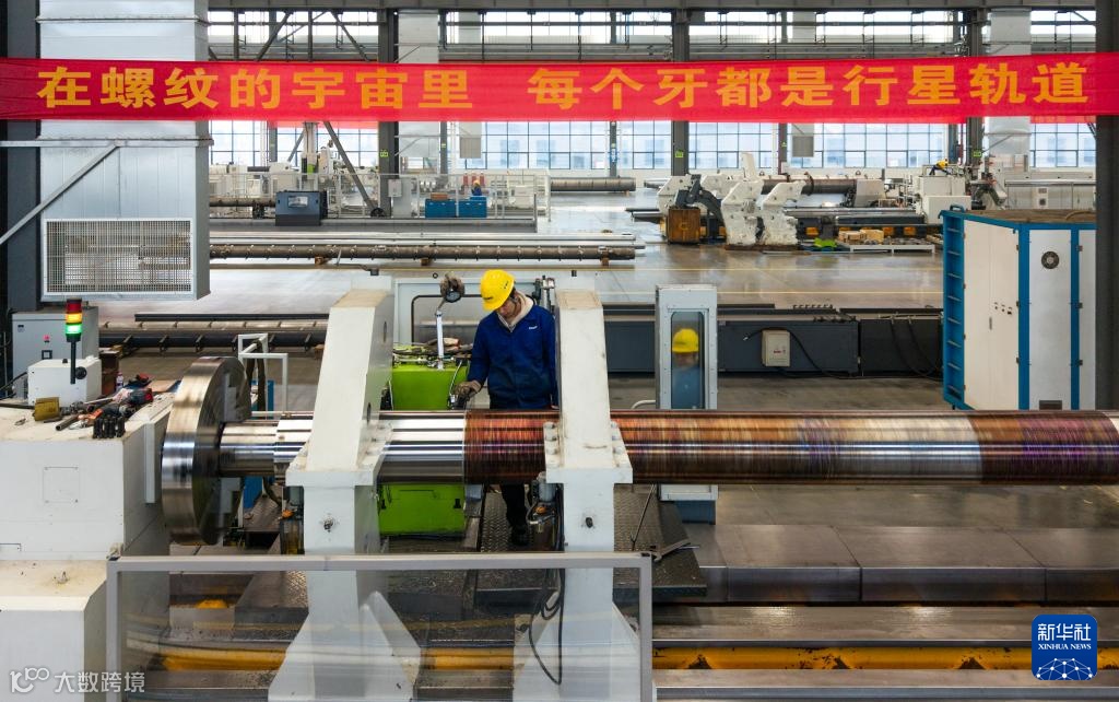 1月14日,在位于常德高新區(qū)的湖南特力液壓有限公司,工人在生產超長型液壓油缸(無人機照片)。