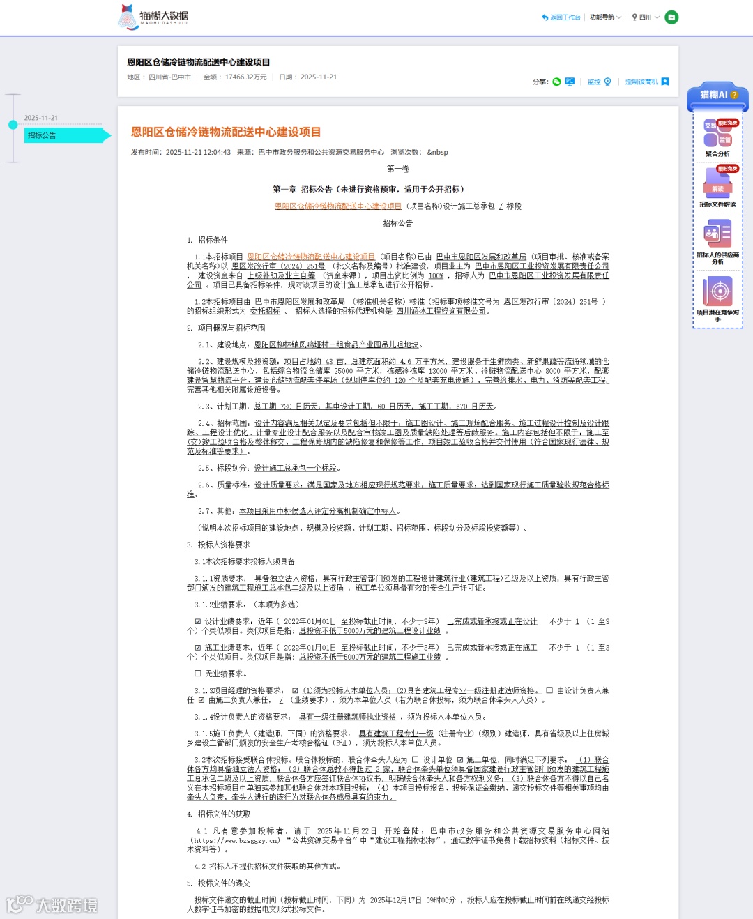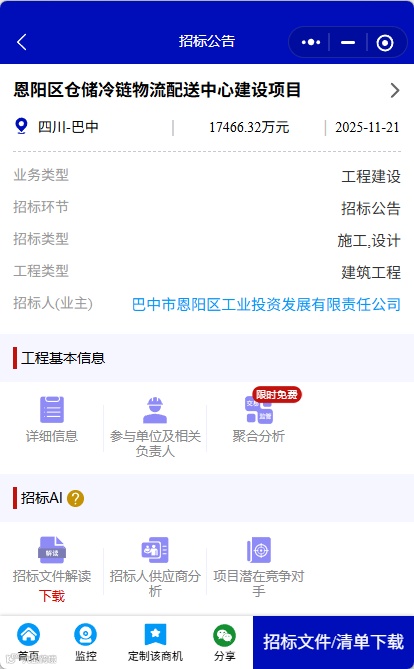 【巴中】1.74億!巴中市恩陽區(qū)倉儲(chǔ)冷鏈物流配送中心建設(shè)項(xiàng)目啟動(dòng)招標(biāo)! 貓糊大數(shù)據(jù)