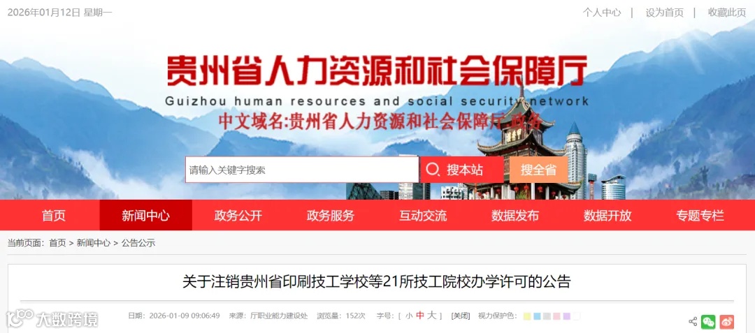 近日,貴州省人力資源和社會保障廳官網(wǎng)發(fā)布了《關(guān)于注銷貴州省印刷技工學(xué)校等21所技工院校辦學(xué)許可的公告》。