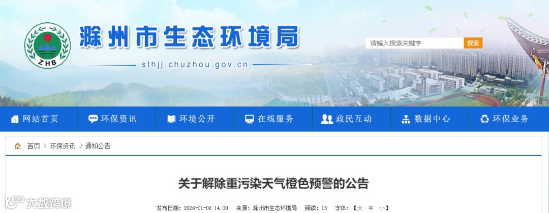 2026年1月5日11時(shí),我市發(fā)布了重污染天氣橙色預(yù)警,并啟動(dòng)Ⅱ級(jí)應(yīng)急響應(yīng)措施。自1月6日午時(shí)開始,全市大氣擴(kuò)散條件轉(zhuǎn)好,滿足《滁州市重污染天氣應(yīng)急預(yù)案(2024年修訂)》橙色預(yù)警級(jí)別解除條件。經(jīng)市生態(tài)文明建設(shè)生態(tài)環(huán)境保護(hù)委員會(huì)辦公室研究,并報(bào)市政府審批同意,決定于2026年1月6日14時(shí)解除重污染天氣橙色預(yù)警,并終止Ⅱ級(jí)應(yīng)急響應(yīng)。
