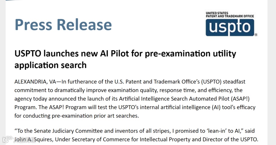 美國專利商標(biāo)局(USPTO)剛剛投下了一顆重磅炸彈:正式啟動其“人工智能檢索自動化試點計劃”(Artificial Intelligence Search Automated Pilot Program),簡稱“ASAP!”。