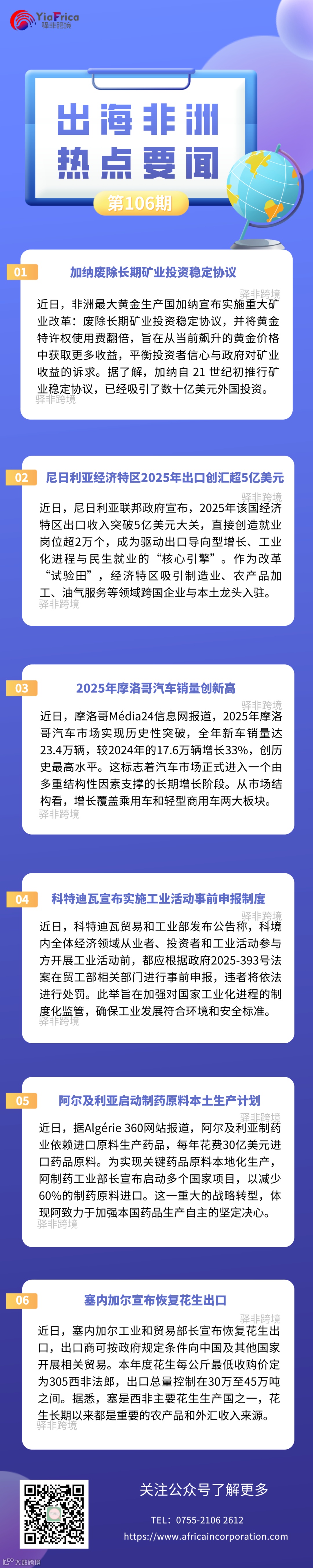 加納廢除長期礦業(yè)投資穩(wěn)定協(xié)議、尼日利亞經(jīng)濟特區(qū)2025年出口創(chuàng)匯超5億美元|非洲近期熱點要聞一覽【106期】 孚銳商務