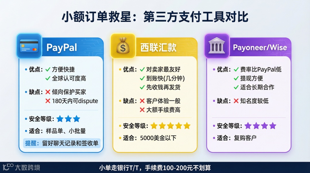 樣品單、小批量測(cè)試單,走銀行T/T手續(xù)費(fèi)太高(通常100-200人民幣一筆),這時(shí)候就用: