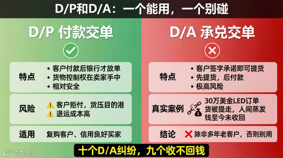 除非對(duì)方是合作多年的老客戶,否則千萬(wàn)別用D/A。 我見(jiàn)過(guò)的D/A糾紛,十個(gè)有九個(gè)是收不回錢的。