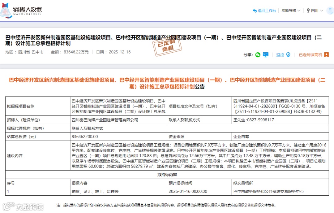2025年12月16日,全國公共資源交易平臺(四川省·巴中市)發(fā)布重磅招標計劃:巴中經(jīng)濟開發(fā)區(qū)新興制造園區(qū)、智能制造產(chǎn)業(yè)園區(qū)(一期、二期)設(shè)計施工總承包項目正式啟動,總投資8.3646億元,涵蓋三大產(chǎn)業(yè)園區(qū)基礎(chǔ)設(shè)施及廠房建設(shè)。項目資金來源為企業(yè)自籌,預(yù)計2026年1月16日開標,為建筑行業(yè)企業(yè)帶來設(shè)計、施工、監(jiān)理等多環(huán)節(jié)商業(yè)機會。