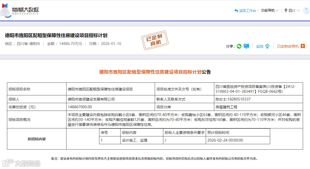 2026年1月16日,四川省公共資源交易信息網(wǎng)發(fā)布了德陽(yáng)市旌陽(yáng)區(qū)配租型保障性住房建設(shè)項(xiàng)目的招標(biāo)計(jì)劃。該項(xiàng)目總投資1.4886億元,涉及多個(gè)小區(qū)的房屋收購(gòu)及裝飾裝修工程,為建筑行業(yè)相關(guān)企業(yè)提供了新的商業(yè)機(jī)會(huì)。