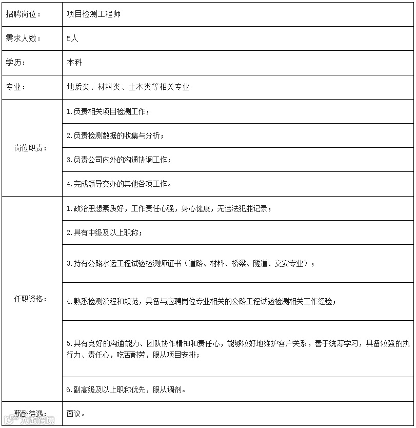 四川濟(jì)通工程試驗(yàn)檢測(cè)有限公司成立于2011年,主要從事公路、水運(yùn)、鐵路、環(huán)境、市政、房建、機(jī)場(chǎng)、水利水電等工程項(xiàng)目的試驗(yàn)檢測(cè)與研究。為滿足公司戰(zhàn)略發(fā)展和業(yè)務(wù)運(yùn)營(yíng)需要,優(yōu)化人力資源配置,吸引和選拔優(yōu)秀人才,打造高素質(zhì)、專業(yè)化的人才隊(duì)伍,現(xiàn)面向社會(huì)公開(kāi)招聘項(xiàng)目專業(yè)技術(shù)人員,具體公告如下: