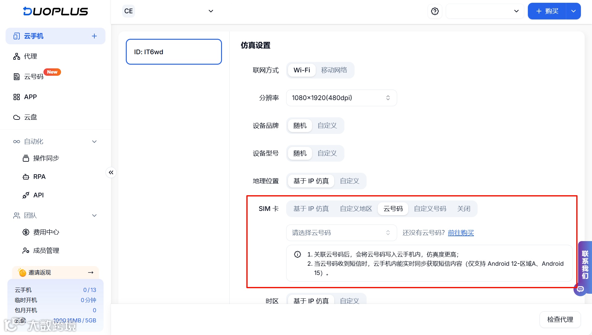 DuoPlus云號碼支持關聯(lián)云手機使用,用戶在仿真設置中可以選擇對應的云號碼,號碼信息會直接關聯(lián)設備,提升賬號操作環(huán)境的仿真度。