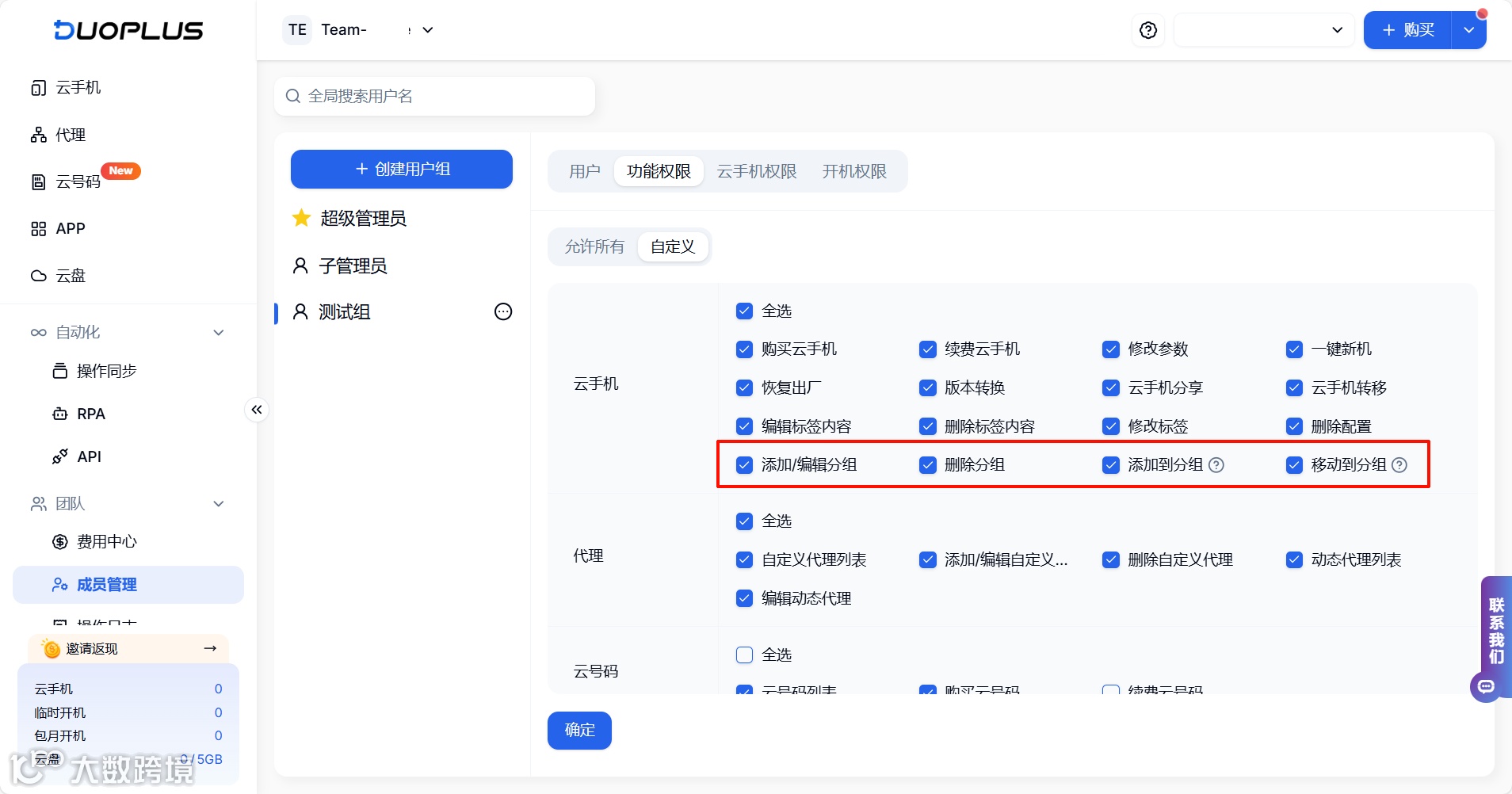 為了更靈活地管理云手機,DuoPlus新增云手機的分組權限,管理員可以給不同用戶組分配權限,成員可以根據權限輕松創(chuàng)建、編輯或移動云機到分組,實現云手機的有序管理。