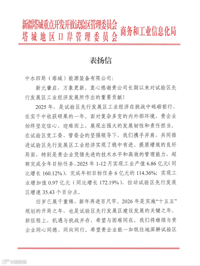 新元肇啟,萬象更新。近日,新疆分公司收到塔城重點開發(fā)開放試驗區(qū)管委會感謝信,信中高度肯定分公司助力試驗區(qū)先行發(fā)展區(qū)工業(yè)經(jīng)濟高質(zhì)量發(fā)展的突出貢獻,向全體員工致以誠摯謝意。