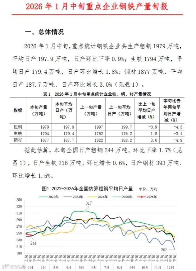 中鋼協(xié)數(shù)據(jù)顯示,2026年1月中旬,重點統(tǒng)計鋼鐵企業(yè)共生產(chǎn)粗鋼1979萬噸,平均日產(chǎn)197.9萬噸,日產(chǎn)環(huán)比下降0.9%;生鐵1704噸,平均日產(chǎn)179.4萬噸,日產(chǎn)環(huán)比增長1.8%;鋼材1877萬噸,平均日產(chǎn)187.7萬噸,日產(chǎn)環(huán)比增長3.0%。據(jù)此估算,本旬全國日產(chǎn)粗鋼244萬噸、環(huán)比下降1.7%,日產(chǎn)生鐵216萬噸、環(huán)比增長0.6%,日產(chǎn)鋼材393萬噸、環(huán)比增長1.5%。