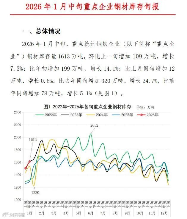 2026年1月中旬,重點統(tǒng)計鋼鐵企業(yè)鋼材庫存量1613萬噸,環(huán)比上一旬增加109萬噸,增長7.3%;比年初增加199萬噸,增長14.1%;比上月同旬增加12萬噸,增長0.8%:比去年同旬增加320萬噸.增長24.7%,比前年同旬增加78萬噸,增長5.1%。