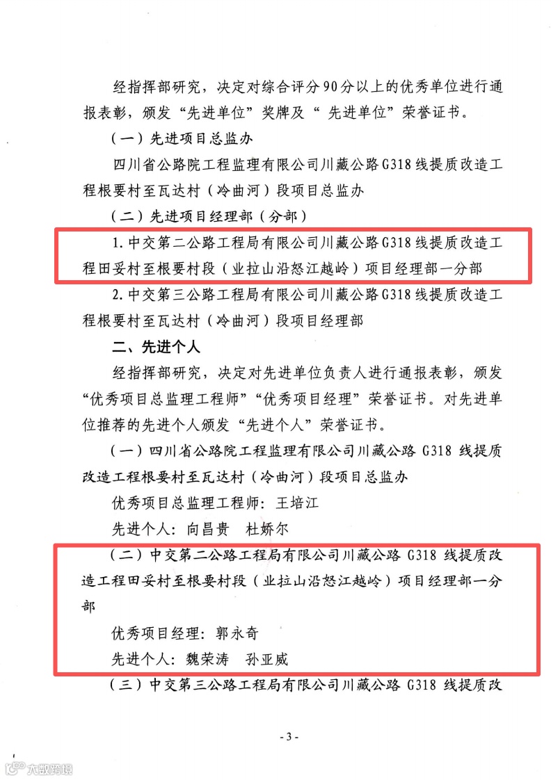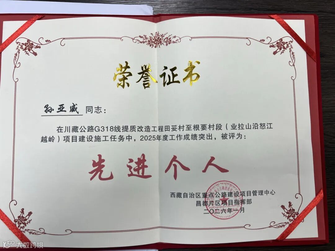 與此同時(shí),川藏公路G318線提質(zhì)改造工程三合一項(xiàng)目管理辦公室印發(fā)《關(guān)于表彰所轄在建項(xiàng)目2025年度“先進(jìn)集體”、“先進(jìn)個(gè)人”的通報(bào)》(三合一項(xiàng)管字〔2026〕4號(hào)),對過去一年中攻堅(jiān)克難、履職盡責(zé)的先進(jìn)單位與個(gè)人予以表彰。西藏G318線三合一公路一分部成功獲評(píng)“先進(jìn)集體”,分部員工李鑒煬、梁淞、旦真旺布三人同步獲評(píng)“先進(jìn)個(gè)人”,實(shí)現(xiàn)集體與個(gè)人榮譽(yù)雙豐收。