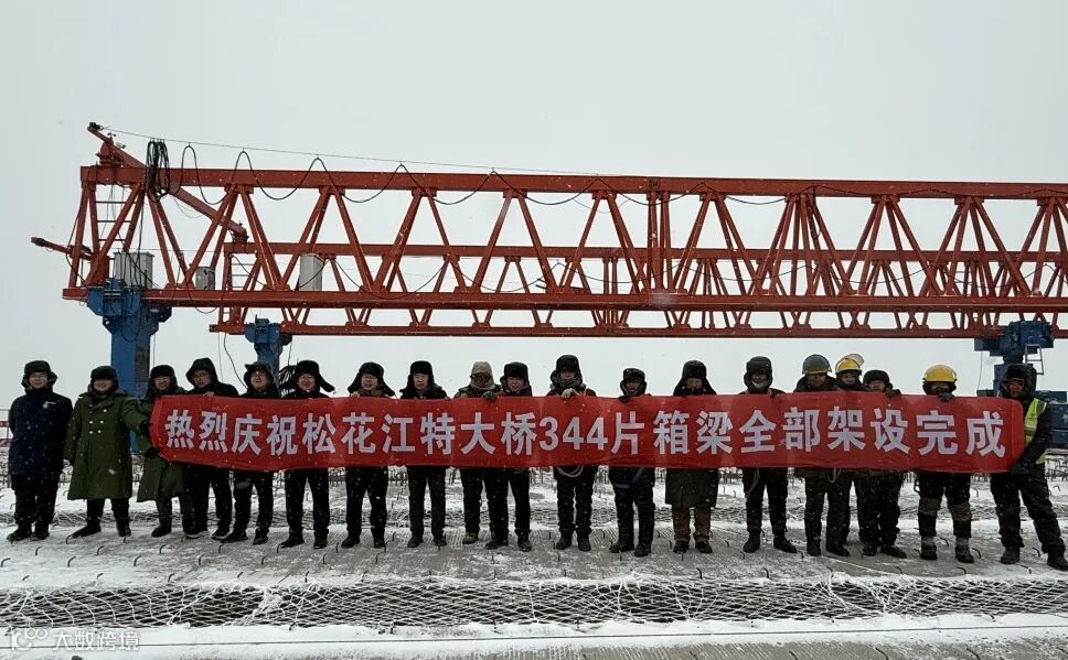 工程架梁施工段位于松花江上,預(yù)制箱梁長40米,寬2.4米,高2米,共計344片,施工難度遠(yuǎn)超陸上作業(yè),面對航道通航要求高、環(huán)境因素復(fù)雜等多重考驗(yàn),施工過程中,項(xiàng)目團(tuán)隊(duì)運(yùn)用“GPS定位+全站儀雙控監(jiān)測”技術(shù),優(yōu)化作業(yè)方案,克服嚴(yán)寒、風(fēng)雪等惡劣天氣影響,將梁體落位誤差精準(zhǔn)控制在3毫米內(nèi),圓滿完成架梁任務(wù)。