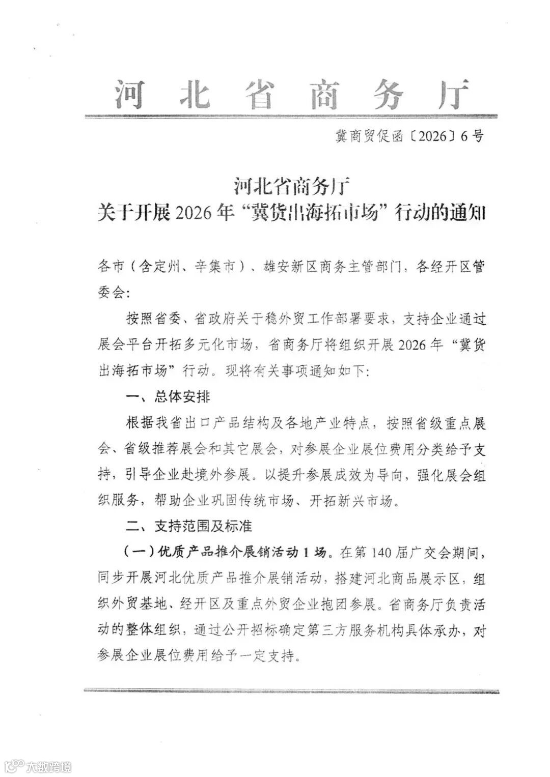 轉(zhuǎn)發(fā):河北省商務(wù)廳關(guān)于開展2026年"冀貨出海拓市場"行動的通知