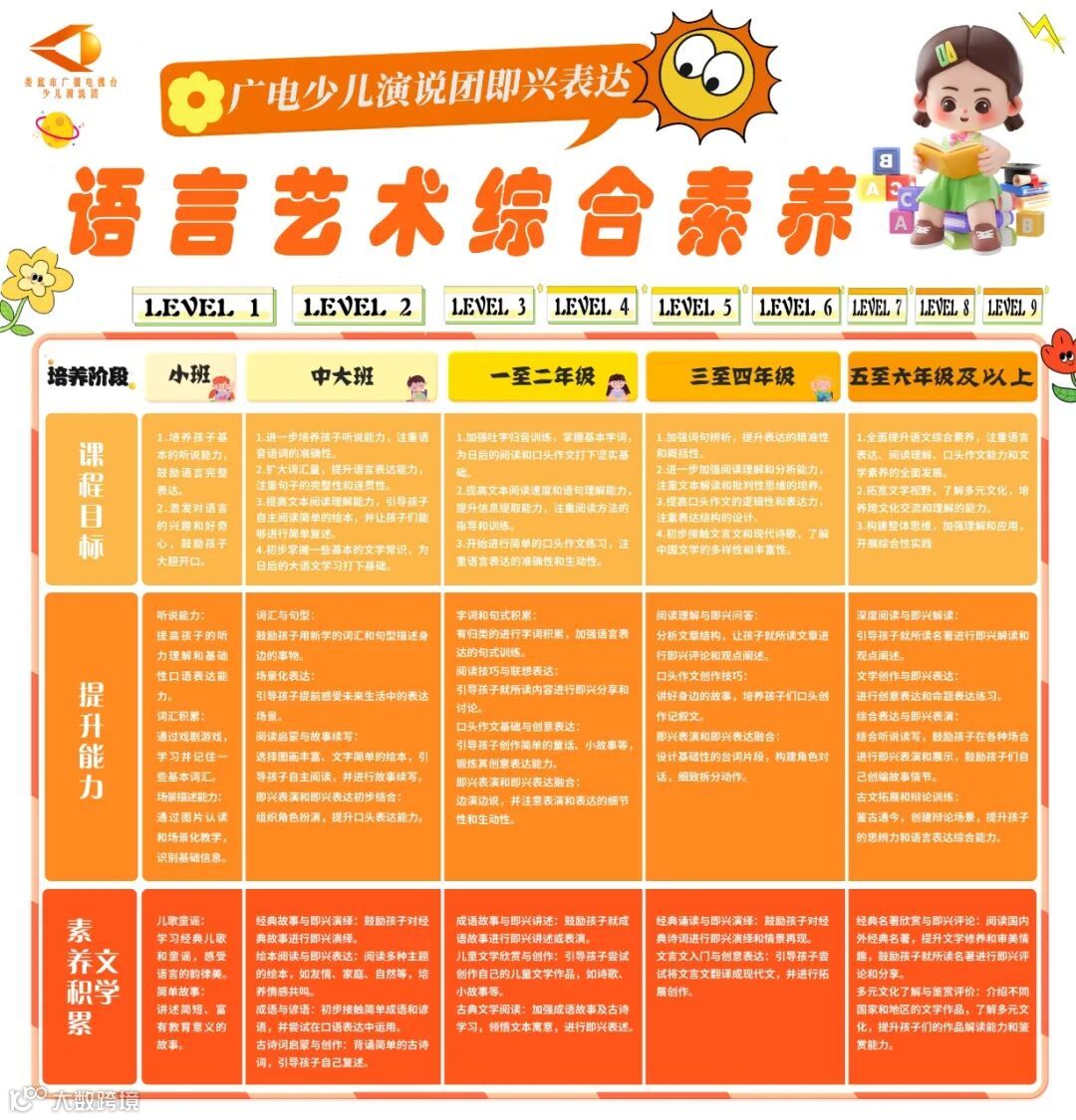 導讀:“語言藝術”素養(yǎng)課程來啦~婁底廣電少兒演說團課程體系升級提升孩子語言表達能力,培養(yǎng)孩子文化素養(yǎng)全方位提升孩子“聽說讀寫”能力,讓每一個孩子——“能說會道”、“能讀會寫”