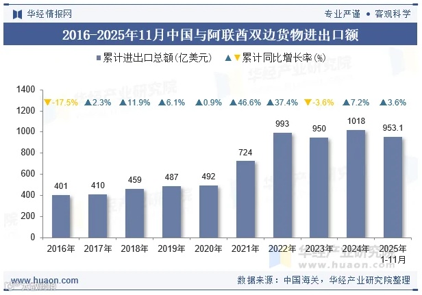 阿聯(lián)酋是中國企業(yè)進(jìn)入中東乃至更廣闊市場的理想門戶。中國已連續(xù)多年保持阿聯(lián)酋第一大貿(mào)易伙伴地位。2025年1-11月,中阿雙邊貨物進(jìn)出口額達(dá)953.12億美元,同比增長3.6%,貿(mào)易往來持續(xù)穩(wěn)健擴(kuò)張。