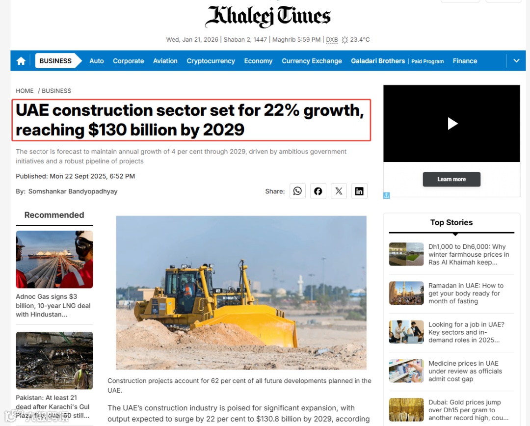 近年來,迪拜、阿布扎比等主要酋長國持續(xù)推進(jìn)住宅、商業(yè)地產(chǎn)、基礎(chǔ)設(shè)施與城市綜合體建設(shè)。數(shù)據(jù)顯示,阿聯(lián)酋建筑業(yè)產(chǎn)值預(yù)計(jì)2029年將達(dá)到約1,308億美元,高鐵、地鐵、辦公與住宅項(xiàng)目交付節(jié)奏明確,投資確定性強(qiáng)。