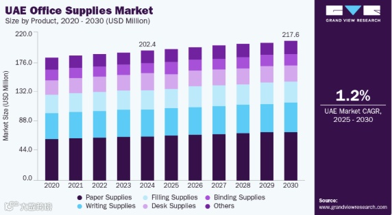 隨著第39號聯(lián)邦法令及《2030年國家高等教育戰(zhàn)略》推進(jìn),學(xué)生人數(shù)增長與教育基建投入增加,帶動辦公用品需求釋放。阿聯(lián)酋辦公用品市場預(yù)計(jì)2025—2030年以約1.2%的年復(fù)合增長率增長,打印紙、紙制品及書寫工具仍為高頻消耗品。