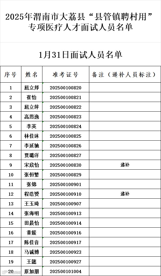 應(yīng)聘2025年渭南市大荔縣“縣管鎮(zhèn)聘村用”專項(xiàng)醫(yī)療人才招聘崗位(崗位代碼:20251232至20251241)并經(jīng)資格復(fù)審合格的應(yīng)聘人員(面試人員名單見附件)。